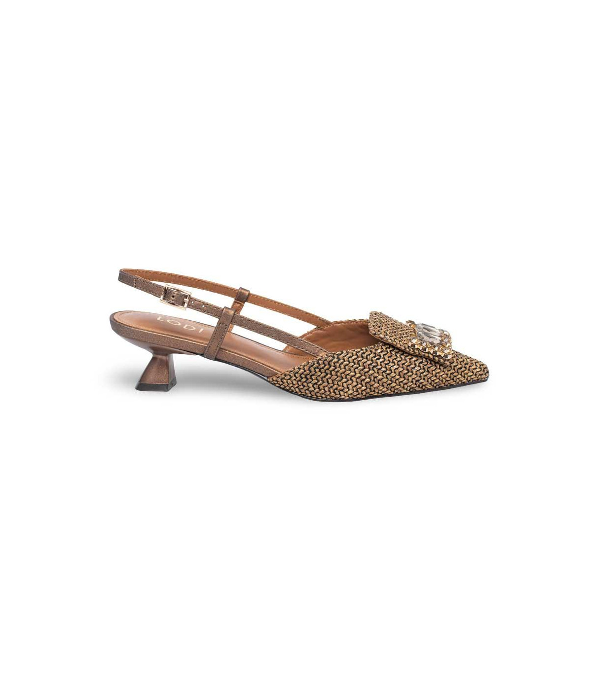 Zapatos con tacón y talón abierto de la firma Lodi | Material exterior: Piel/Rafia | Forrado interior: Piel | Plantilla: Piel | Suela: Goma | Altura: 5 cm de tacón | Hecho en España.