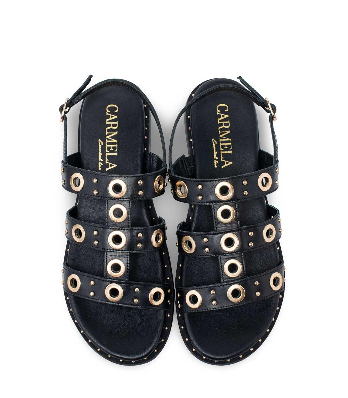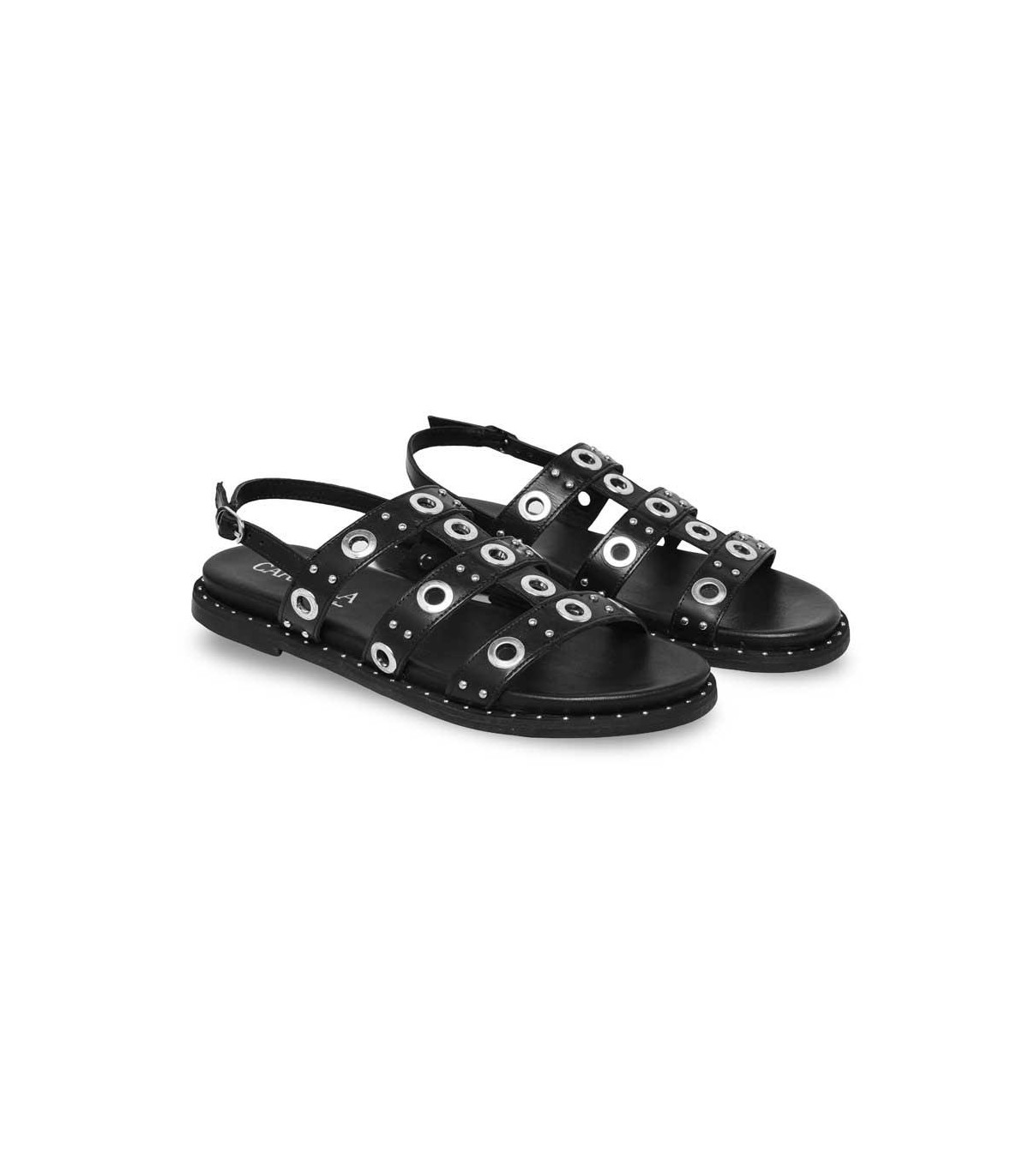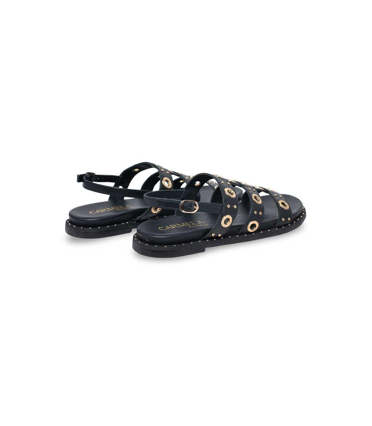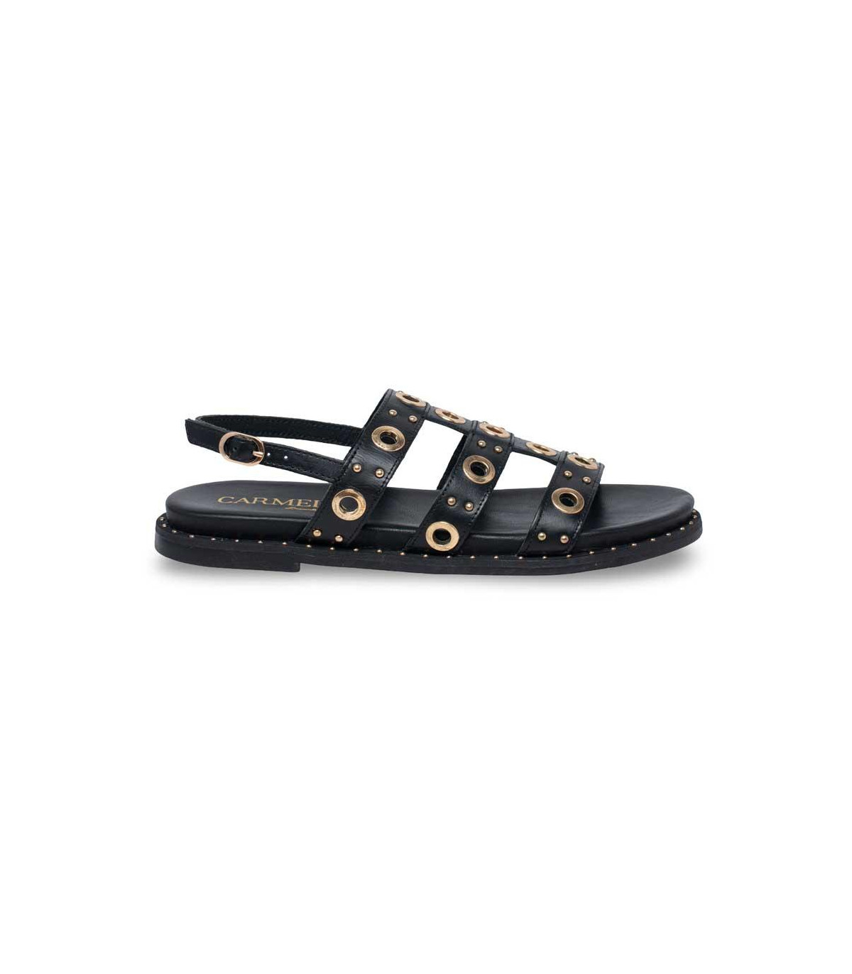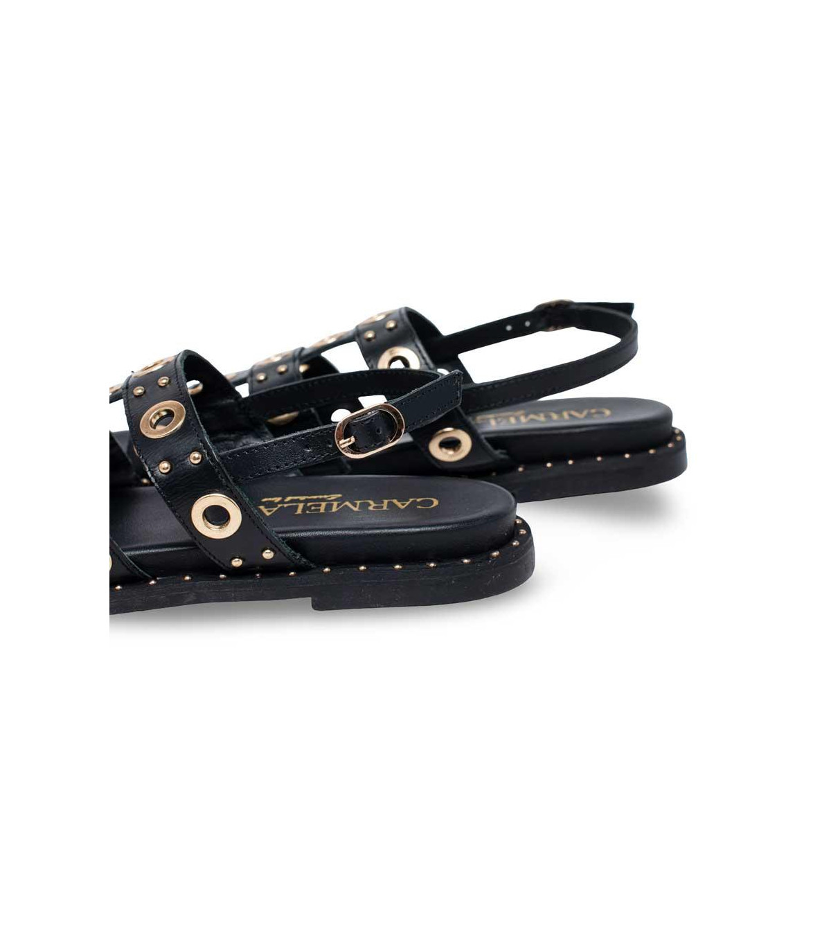Sandalias bio con detalles de adornos metálicos de la firma Carmela | Material exterior: Piel | Forrado interior: Piel | Plantilla: Piel | Suela: Goma | Altura: 3 cm de cuña.